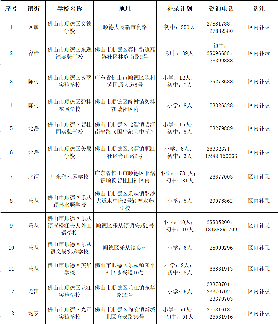 在本区不能完成招生计划,审批机关为市教育行政部门的学校,在保障住宿条件的前提下,经区教育行政部门审核同意并报市教育行政部门批准,可适当面向市内区外补录。具体名单及补录计划由市教育行政部门在7月中下旬发布,请密切留意佛山教育微信公众号。