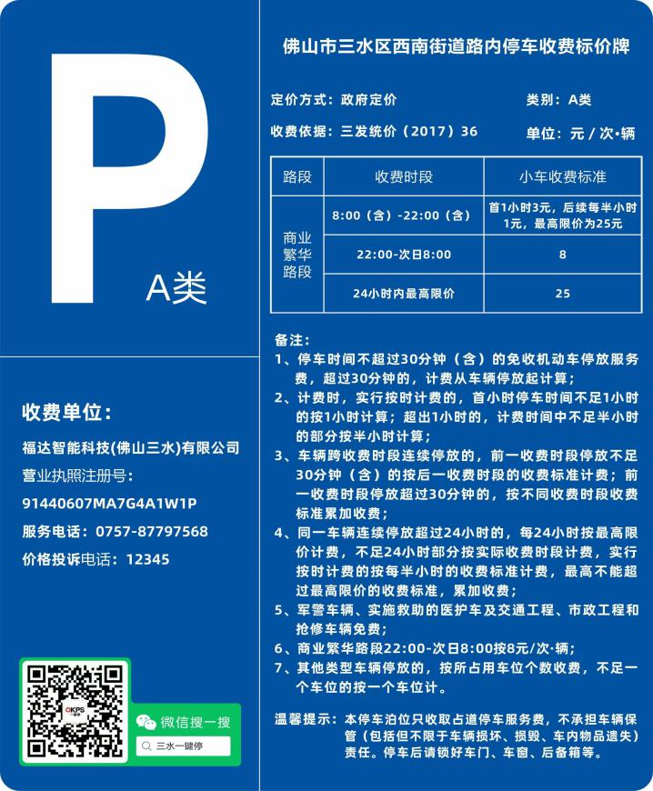 根据三水区发展规划和统计局三发统价【2017】36号文件规定,西南路内停车收费按照商业繁华路段(A类)和一般路段(B类)的分类,及日夜停车时段进行区别收费。