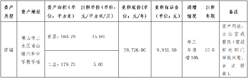 为充分盘活南山镇的公有资产及满足社会租赁需求,现佛山市三水区南山公有资产投资管理有限公司定于2022年7月12日(星期二)上午10:00在南山镇公共资源交易所(201室),对位于佛山市三水区南山镇六和中学教学楼的商铺进行公开竞租。根据《三水区南山镇公有资产出租管理暂行办法》(南府发[2016]12号)的相关规定,现将有关事项公告如下: