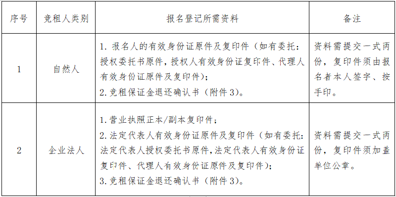(三)出席人员要求:(1)自然人:竞租人需携带本人有效身份证原件(若授权委托他人参加竞租的,代理人须提交授权委托书原件、授权人身份证复印件、代理人身份证原件及复印件,且所有复印件资料一式两份,复印资料须由证件持有人签名并加盖指纹)及竞租保证金汇款或转账凭证单据原件给南山镇公共资源交易所核查。(2)公司法人:需携带加盖单位公章的营业执照正本/副本复印件、法定代表人身份证原件(若授权委托他人参加竞租的,代理人须提交法定代表人授权委托书原件、法定代表人身份证复印件、代理人身份证原件及复印件,且所有复印件资料一式两份并加盖单位公章)及竞租保证金汇款或转账凭证单据原件给南山镇公共资源交易所核查。