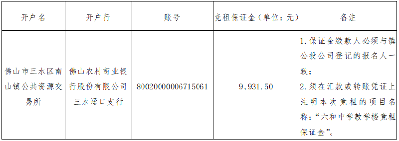 (二)竞租保证金缴纳:经镇公投公司审查符合竞租条件并报名登记成功的意向竞租者,于2022年7月11日(星期一)下午17:00前将竞租保证金汇入佛山市三水区南山镇公共资源交易所银行账户: