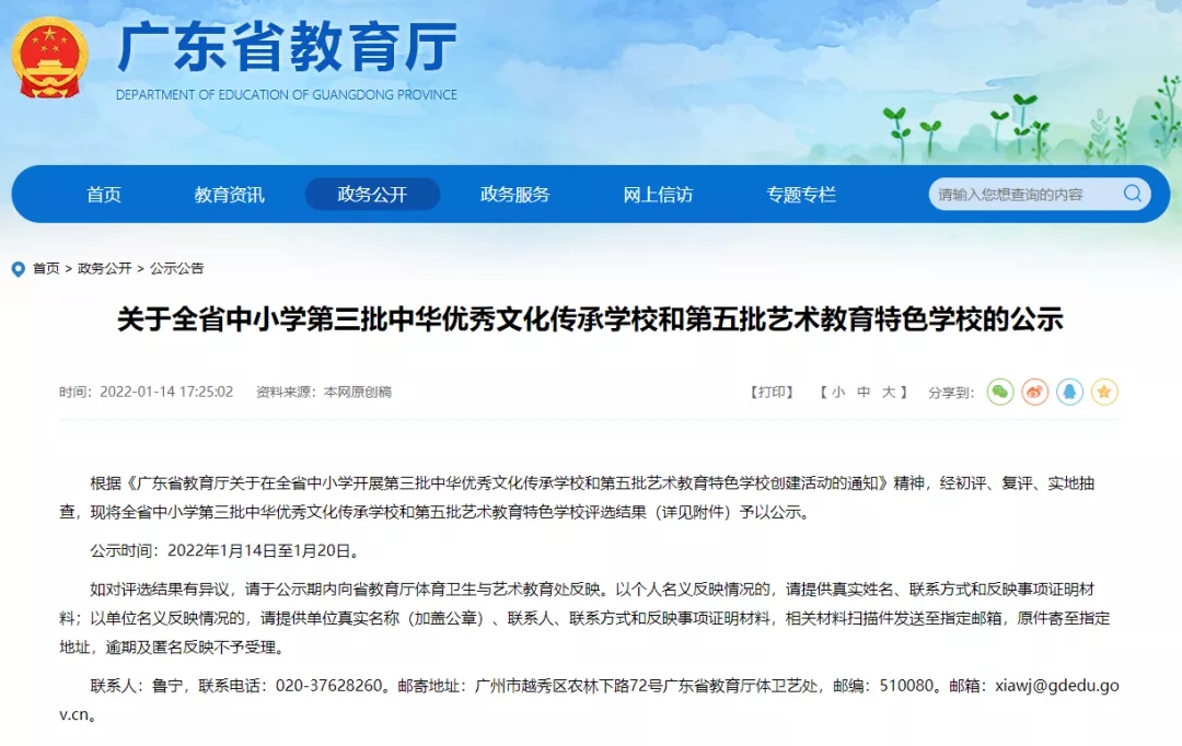 1月14日,广东省教育厅公示了全省中小学第三批中华优秀文化传承学校和第五批艺术教育特色学校评选结果,佛山15所学校上榜。