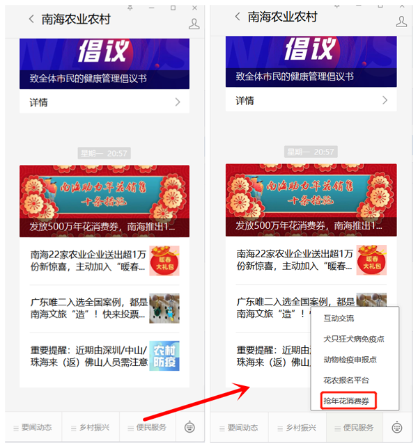 方式一:关注“南海发布”或“南海农业农村”微信公众号,回复关键词【百万消费券】进入抢券通道;