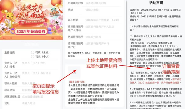 扫码进入页面按提示填写报名信息,上传土地租赁合同或其他证明材料,并详细查看活动声明了解规则: