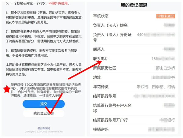 确认无误后提交信息,即可查看自己的信息情况,主办方将尽快审核报名信息,通过审核即可成为南海年花消费券合作花农!