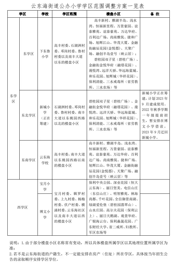 因云东海街道近年适龄儿童入学人数大幅增加,预计云东海学校不能满足2022年秋季学期东学区的入学学位需求,计划新城小学(正在筹建)在2022年秋季学期提前招生,暂安排在博文小学借读,2023年9月迁回新城小学。为此,需进行东学区调整。