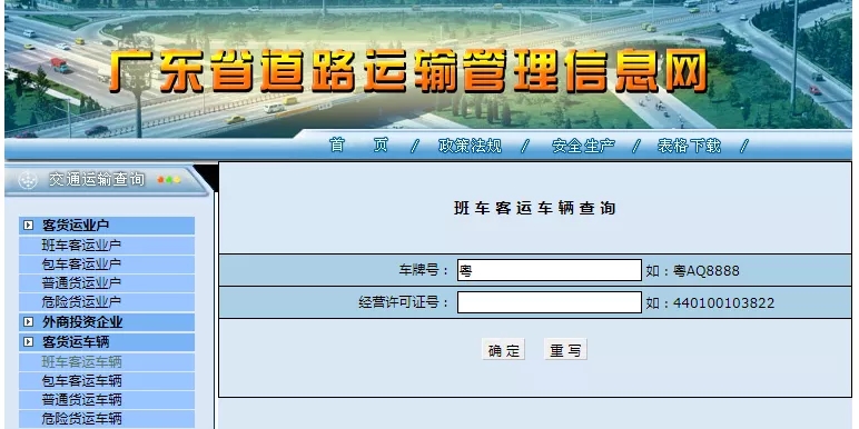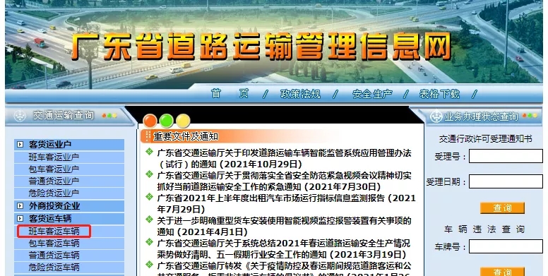 登录广东省道路运输管理信息网(http://dlys.gdcd.gov.cn/),点击左侧菜单栏中的“客货运车辆”,再点击“班车客运车辆”,就能进入到查询页面。