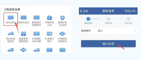 在“交管12123”APP首页点击【更多】→【新车选号】,选择注册省市,并点击【确认信息】。