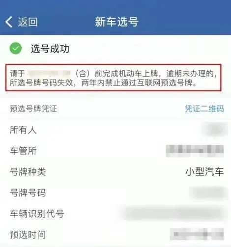 系统提示选号成功后,需在系统提示截止日期前及时到车管所办理注册登记业务。