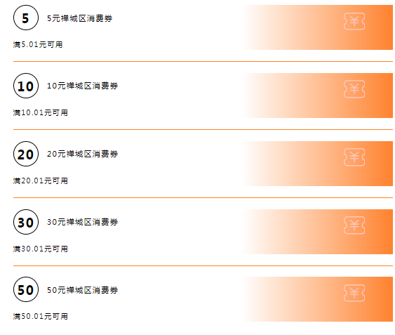 5、可获得消费券设置如下:5元消费券(满5.01元可用),10元消费券(满10.01元可用),20元消费券(满20.01元可用),30元消费券(满30.01元可用),50元消费券(满50.01元可用);