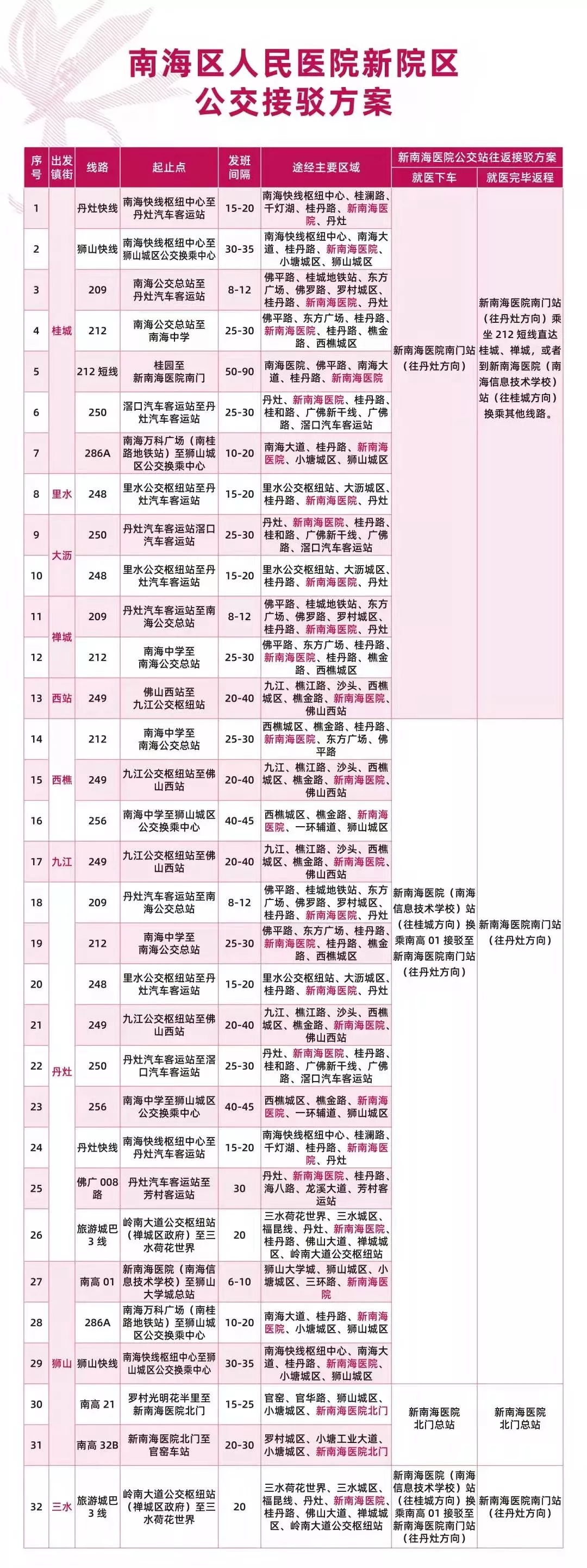 南海区公路事务中心副主任祁明泽介绍,新院区交通围绕公交优先的核心策略,医院门前设置了公交双港湾站台,实现公交与医院零距离换乘,下车就进入医院;医院正门设置了公交接驳服务,可通过212短线和南高01两条公交线路无缝接驳绕行桂丹路南北两侧短距离运行,服务好市民周边公交站最后500米出行到医院。