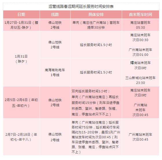 除夕当天(1月31日)佛山地铁2号线、南海有轨电车1号线、地铁广佛线将延长服务时间1.5小时。