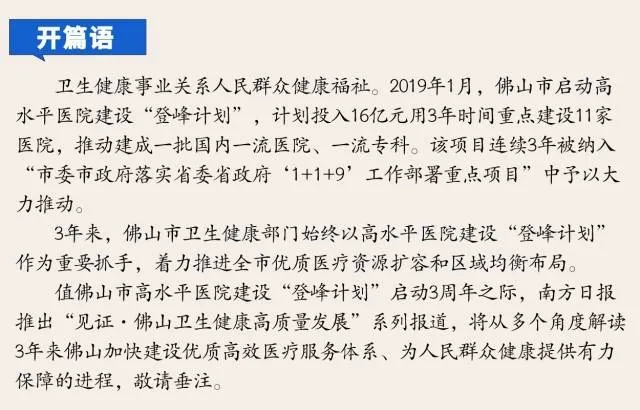 佛山高水平医院建设布局定位于建设珠江西岸医疗卫生中心,“健康佛山”建设的推进将为佛山市争当全省地级市高质量发展领头羊打下更加坚实的健康基础。