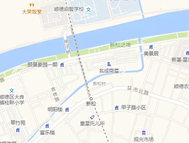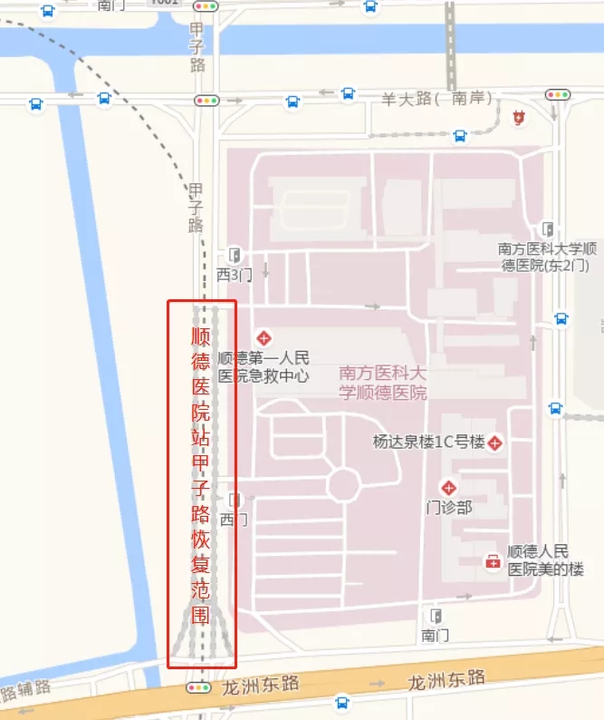 顺德医院站地处龙洲公路及甲子路交叉路口处以北,沿甲子路方向设置,车站东侧是南方医科大学顺德医院。而新松站位于大良城区核心地带,地处桂畔路与环市北路之间,沿甲子路方向设置,车站周边遍布商圈、酒店、学校以及高密度居民区。