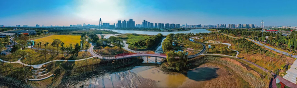 长达80米红色飞桨桥不仅串联公园南北两大园区,使整个湿地公园形成闭环,还是一个名副其实的“网红桥”,吸引市民拍照打卡。