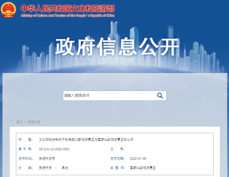 7月6日,文化和旅游部官网发布《文化和旅游部关于拟确定12家旅游景区为国家5A级旅游景区的公示》,公示全文如下: