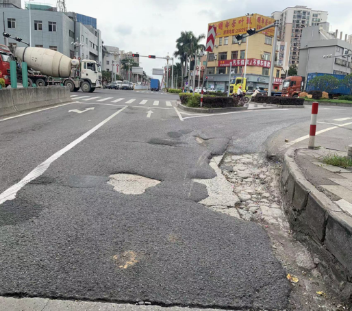 聚龙大道位于顺德区龙江镇顺番路和广湛公路交汇处的高架桥桥底,该处重型车辆较多,交通压力较大,导致路面水泥板破损严重。