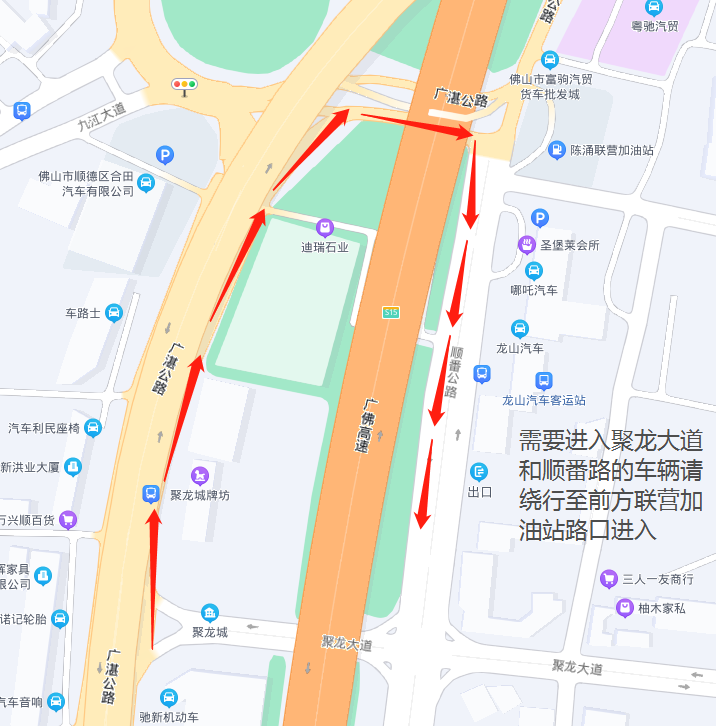 请各位司机朋友注意绕行,需要进入聚龙大道和顺番路的车辆请绕行至前方联营加油站路口进入!