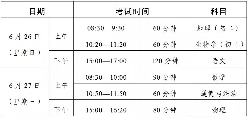 二、体育与健康、音乐、美术、信息技术等科目及物理、化学、生物实验操作等初中学业水平考试的具体时间,由各地市根据本地实际情况确定。非委托省命题地市初中学业水平考试时间,由相关市自行确定。