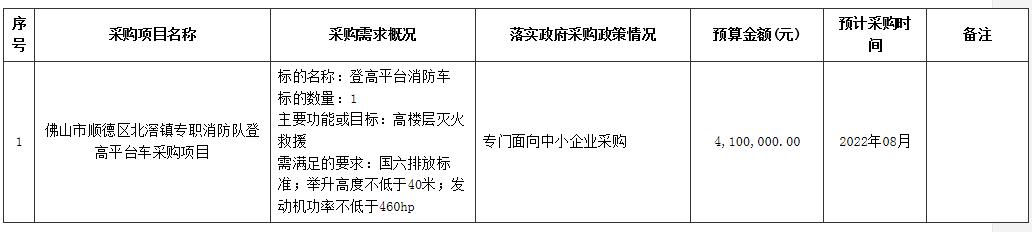 佛山市顺德区北滘镇专职消防队2022年07月至2022年08月政府采购意向
