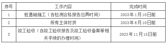 2.3 计划工期:本工程工期总日历天数为420日历天,实际开工日期以双方签订施工合同并以监理人签发的开工令为准,工期不因雨天、假期及办理各方面的手续等因素而延长。若因招标人等不可抗力因素造成暂停施工时,招标人只作工期延长,不作任何经济补偿。同时满足以下工期节点: