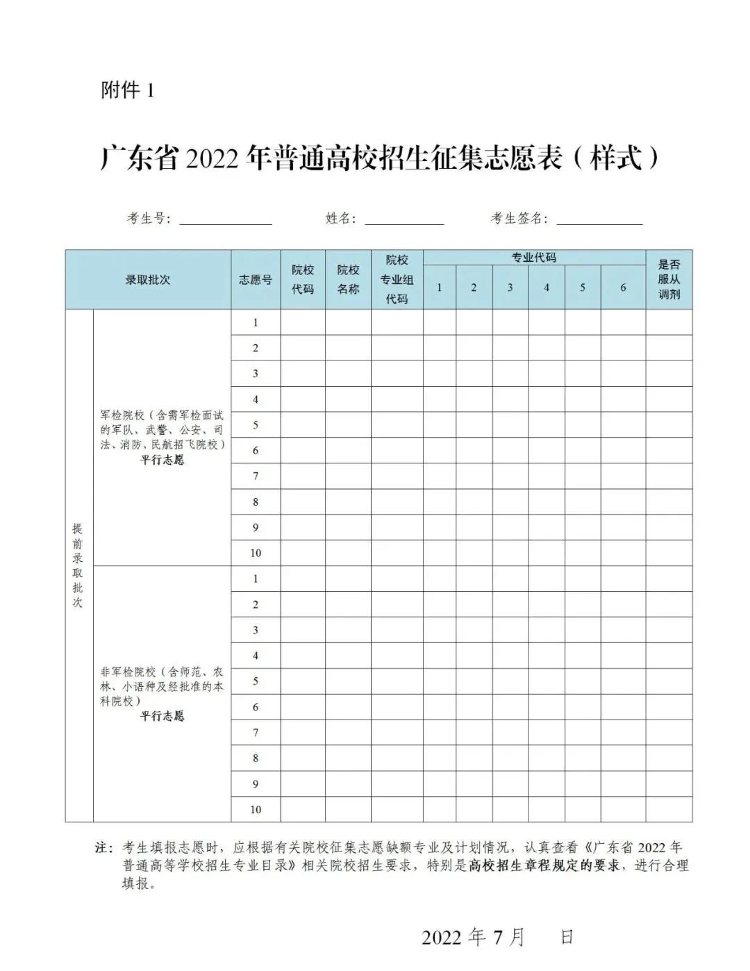1.广东省2022年普通高校招生征集志愿表(样式)