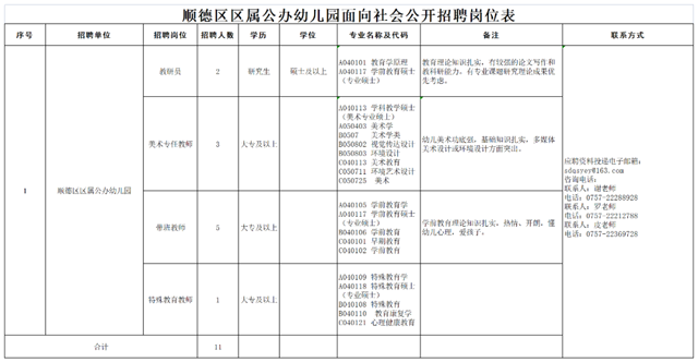 共有11个合同教师岗位。聘用人员在三间区属幼儿园内(含顺德区机关幼儿园、顺德区机关第二幼儿园、顺德区梁銶琚夫人幼儿园)统筹安排,幼儿园按规定与聘用人员签订劳动合同。