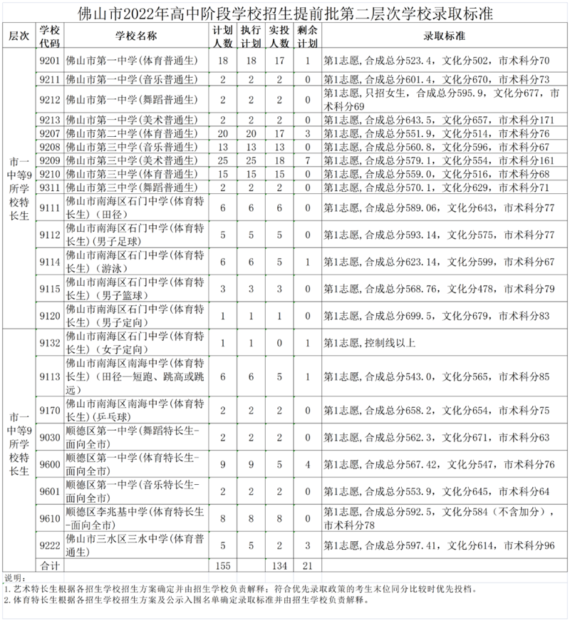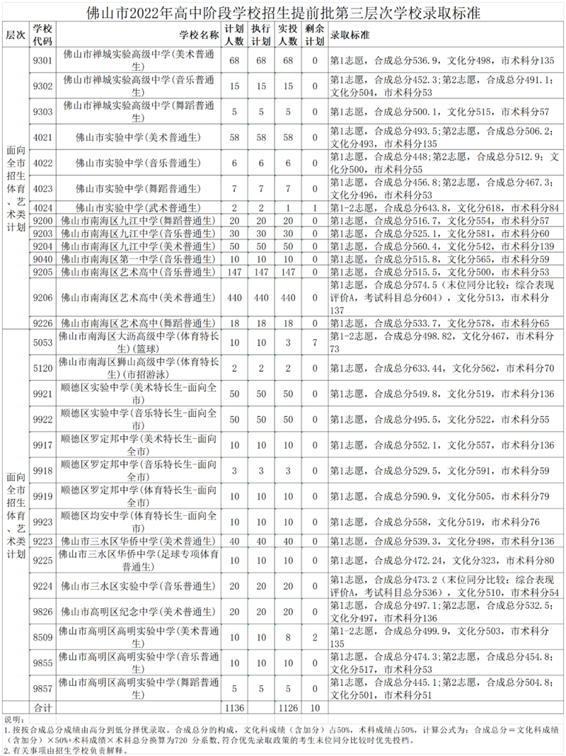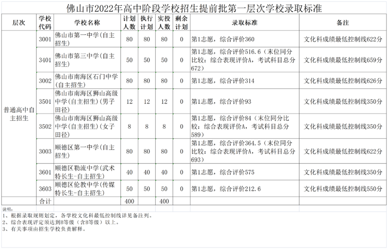 其中,2022年佛山市高中阶段学校招生提前批录取控制分数线及学校录取标准如下。