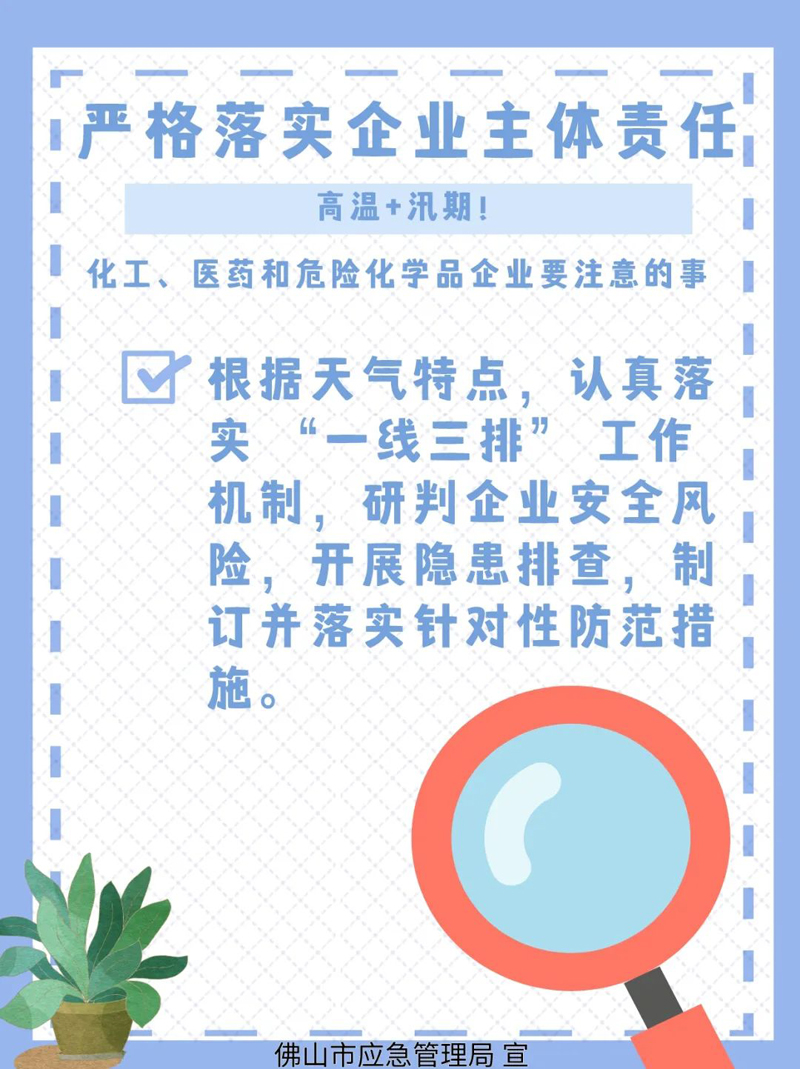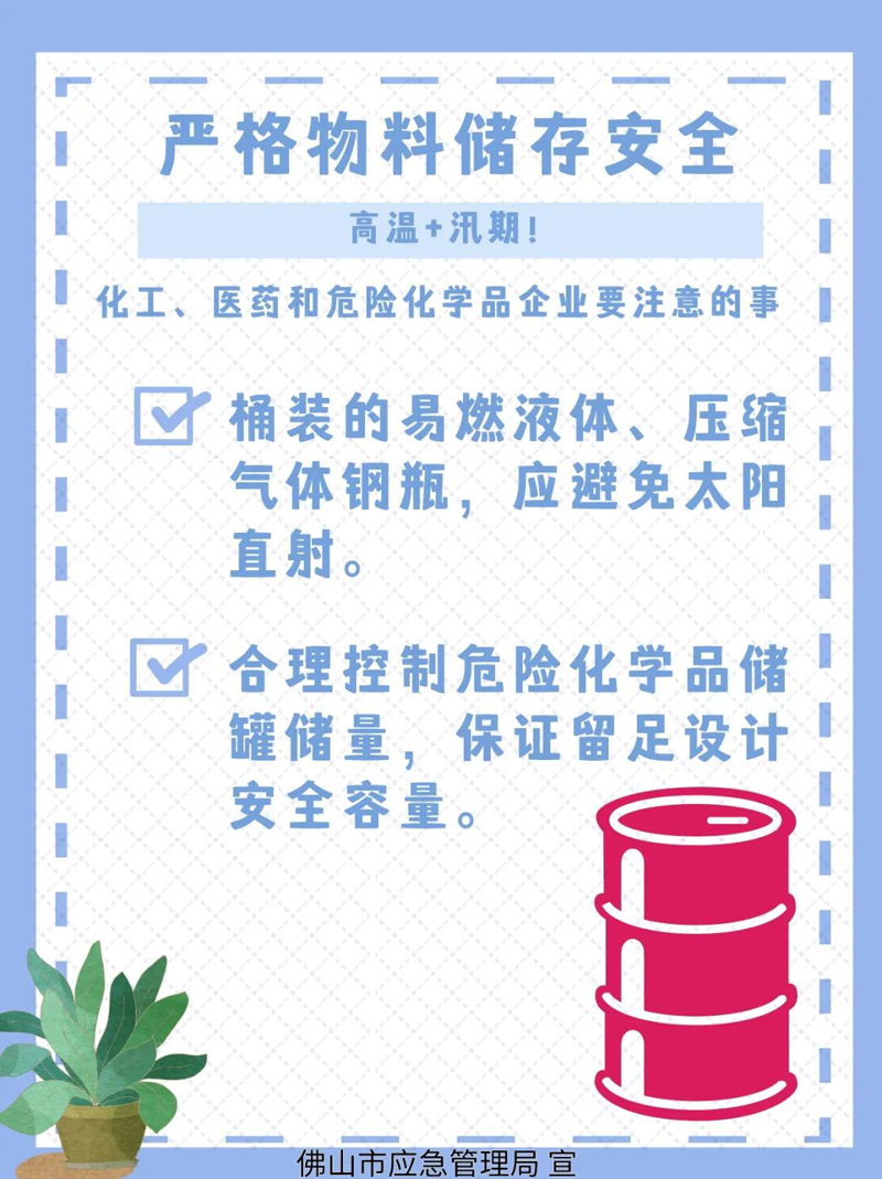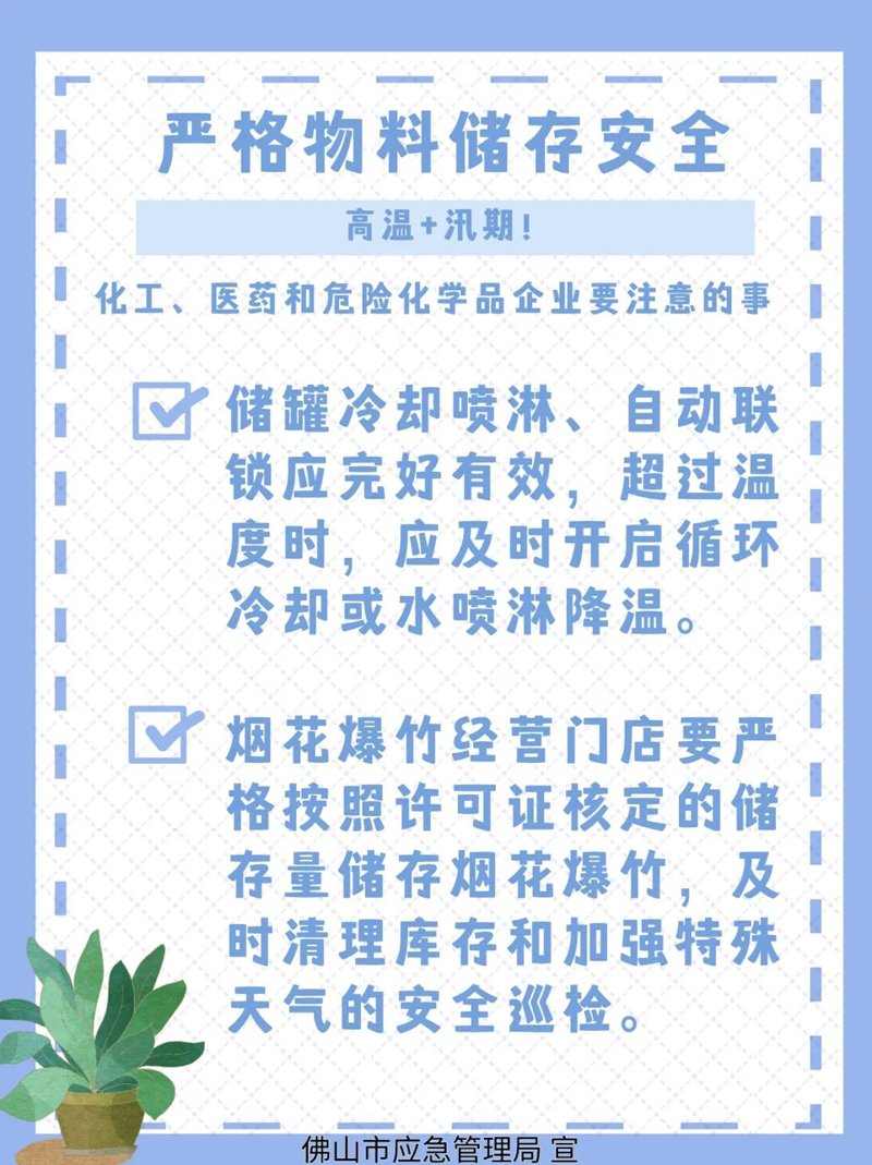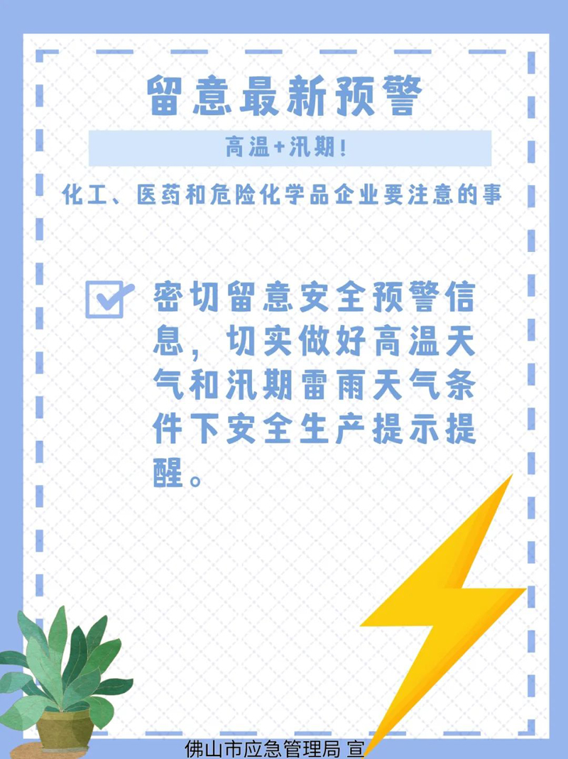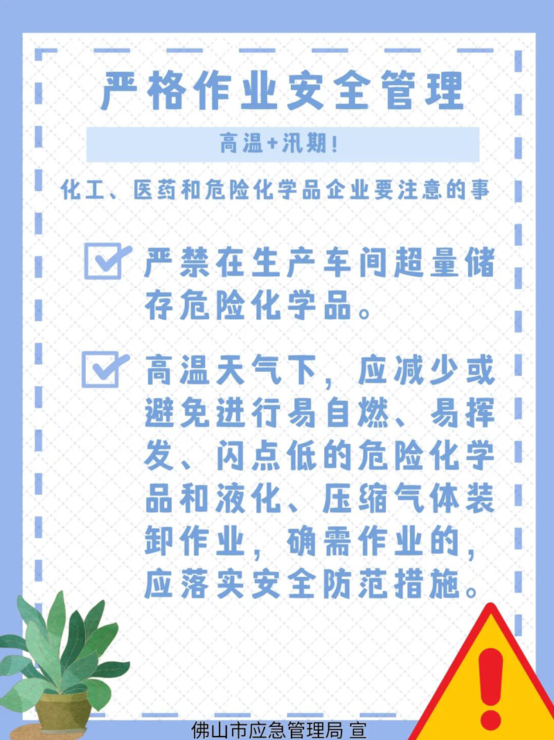 目前,我市已进入晴热高温天气,为切实做好高温天气和汛期雷雨天气条件下化工、医药、危险化学品和烟花爆竹企业安全防范工作,严防引发各类生产安全事故,各企业请参照下列提醒进行自查自纠!