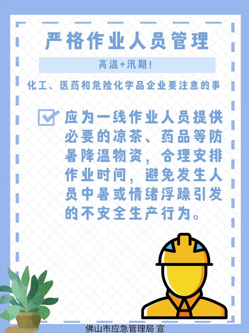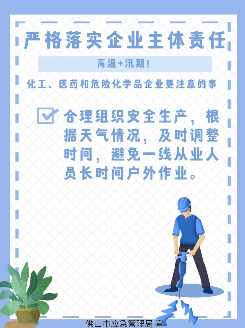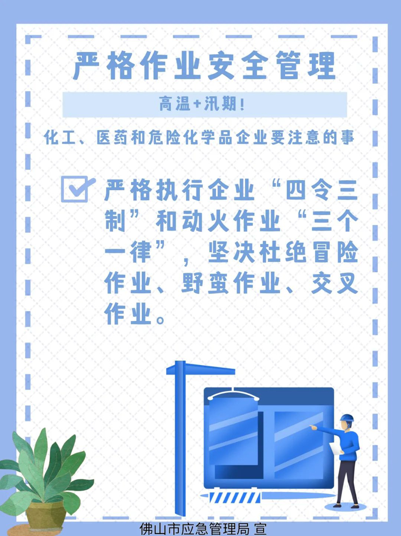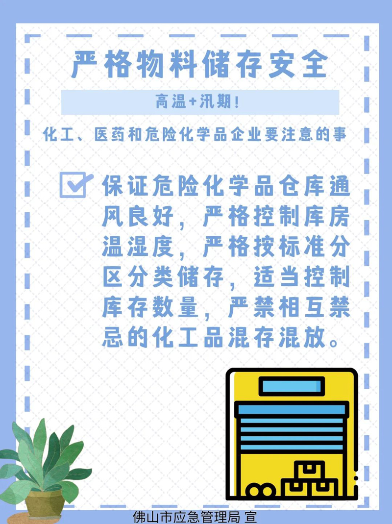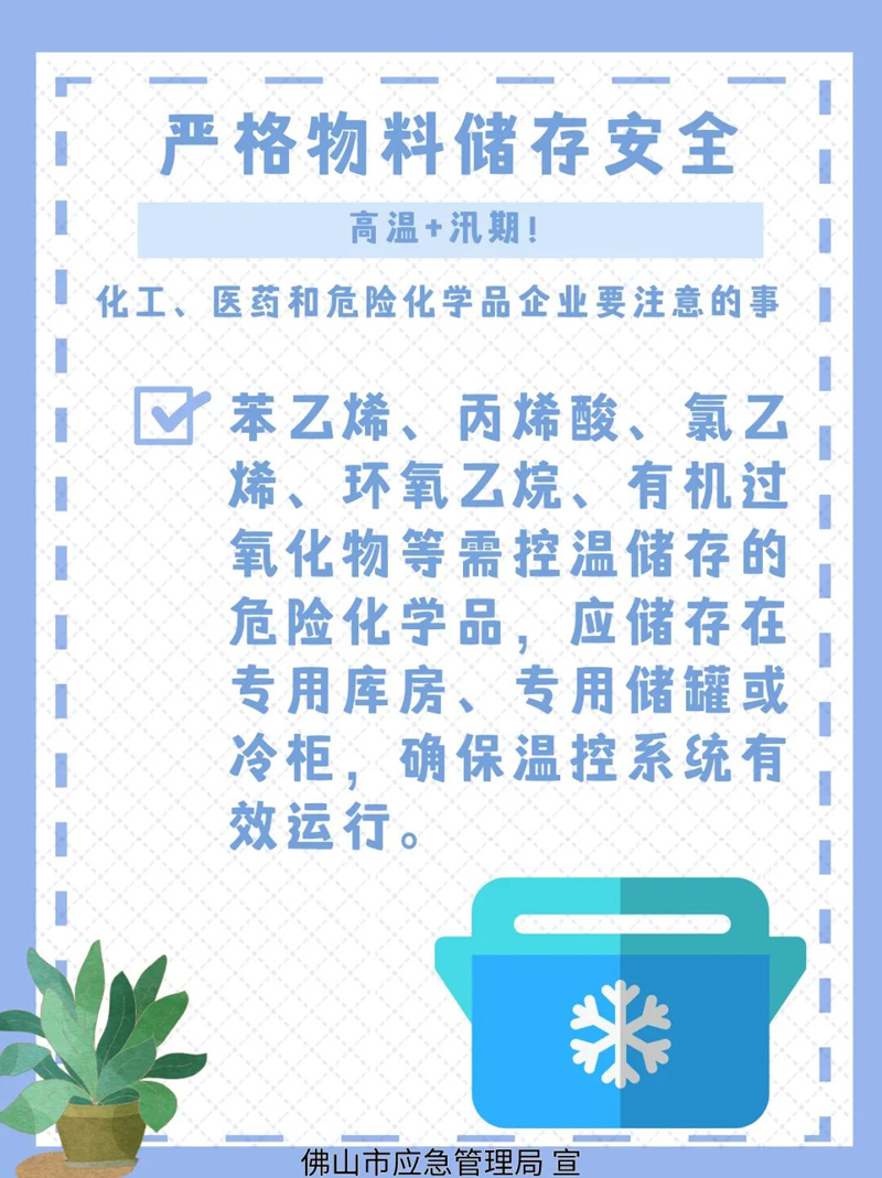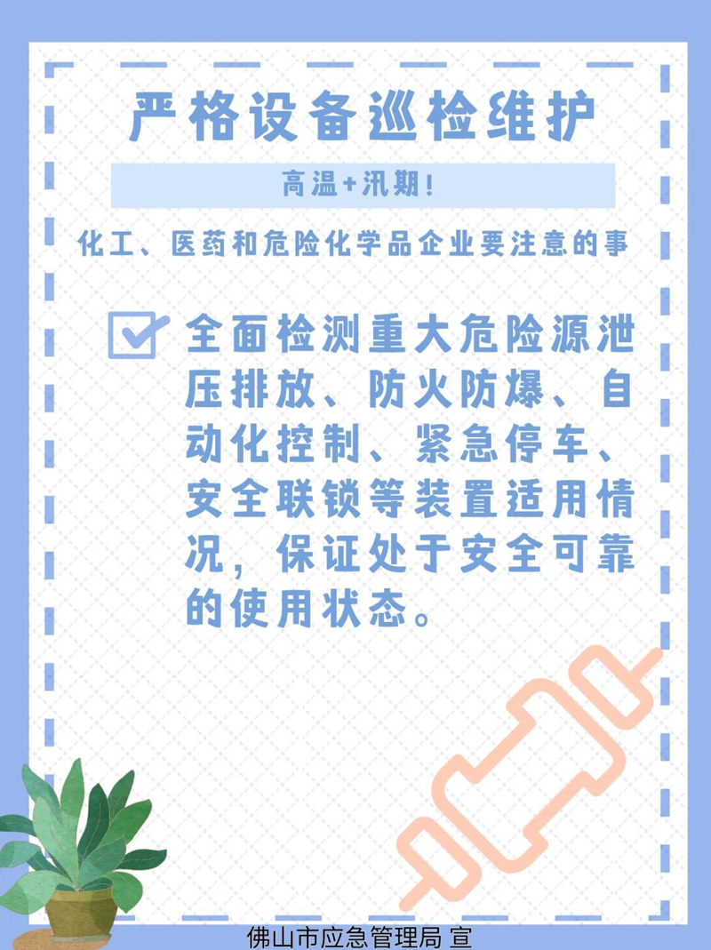 目前,我市已进入晴热高温天气,为切实做好高温天气和汛期雷雨天气条件下化工、医药、危险化学品和烟花爆竹企业安全防范工作,严防引发各类生产安全事故,各企业请参照下列提醒进行自查自纠!