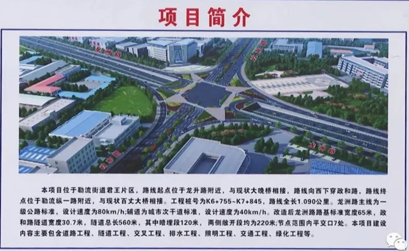 龙洲路快速化改造工程政和路节点工程路线呈东西走向,起点与大晚桥相接,向西下穿政和路,终点与百丈大桥相接,全长约1.090公里。