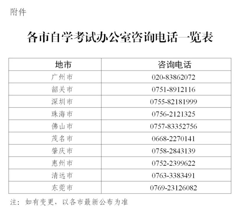 (三)报考过程中遇到的问题直接向当地自学考试办公室咨询(详见附件)。其他未尽事宜,请考生密切关注广东省教育考试院官方微信(微信号:gdsksy)和网站(网址:http://eea.gd.gov.cn)及各地自学考试办公室发布的相关信息。