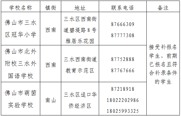 三水区接受补报名民办小学/初中学校名单