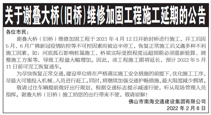 2月8日,记者从佛山市南海交通建设集团有限公司获悉,谢叠大桥(旧桥)维修加固工程施工期将延长,预计2022年5月11日前可完工恢复通车。
