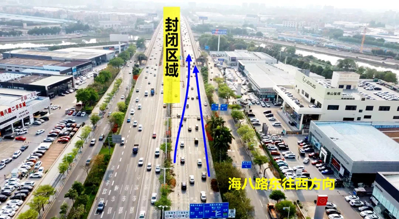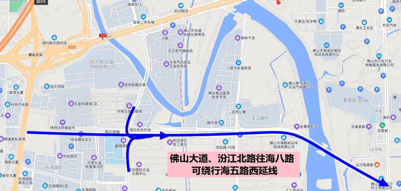 施工期间临时封闭汾江北路驶往海八路的路口,从汾江北路、佛山大道需要前往桂城方向的车辆可选择海五路西延线、文昌路、货站路行驶。