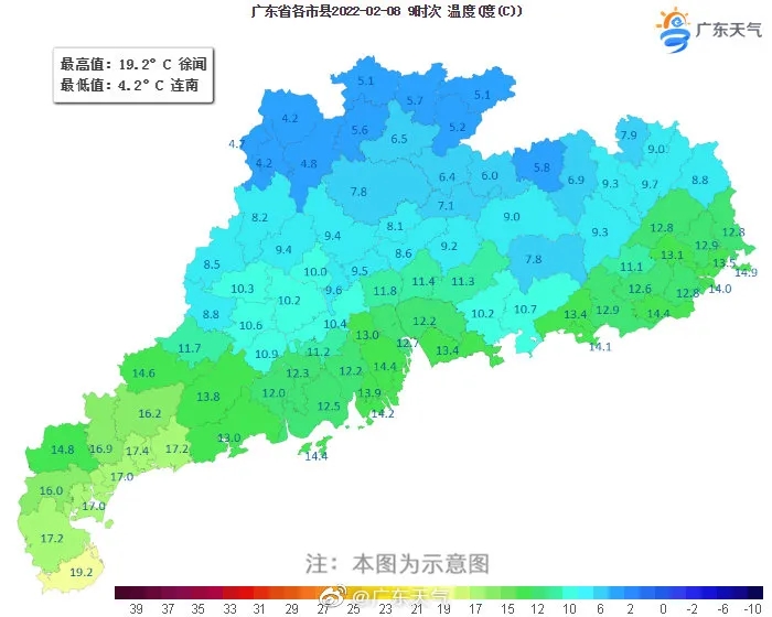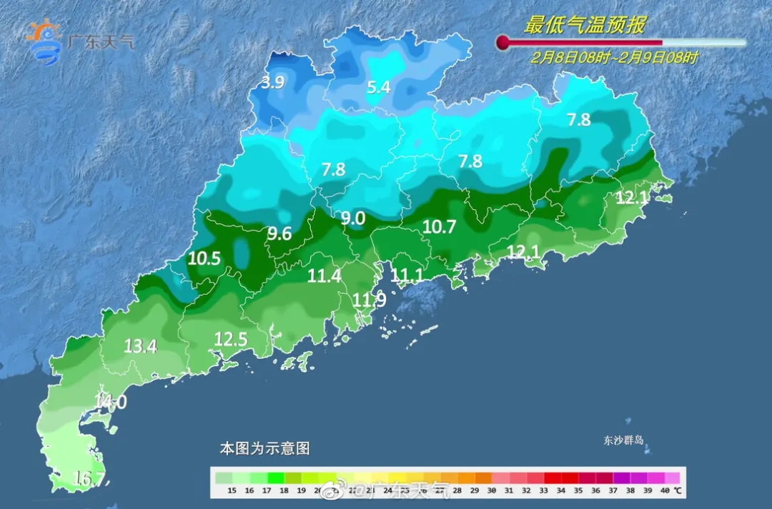 8日,粤东沿海市县小雨转阴天,韶关、清远、肇庆、云浮、粤西阴天有小雨,其余市县阴天为主。最低气温:粤北的北部市县2℃~5℃(高海拔山区零下1℃~1℃);湛江、茂名南部、粤东沿海地区11℃~15℃,其余市县6℃~10℃。