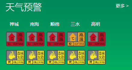 目前,禅城、南海、顺德、高明区高温红色预警信号、三水区高温橙色预警信号,全市森林火险黄色预警信号正在生效。市民要采取有效防暑降温措施,白天尽量减少户外活动,并特别注意防火;相关部门需关注持续高温天气的不利影响。