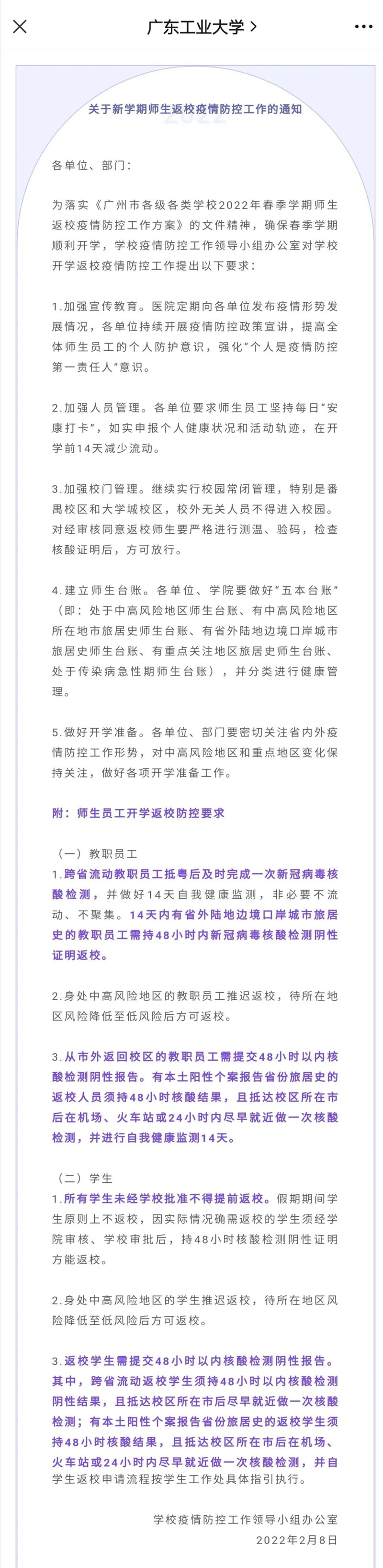 2月7日,广东技术师范大学发布返校通知。通知提到: