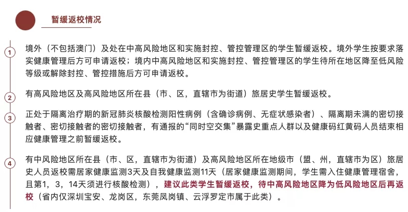 1. 在国内中高风险地区(实时更新)及其所在地市(县、区)的学生,或健康码(粤康码或穗康码)黄/红码的学生,或有病例接触史等尚在排查期的学生,或返校前14天有中高风险地区(实时更新)及其所在地市(县、区)旅居史的学生。