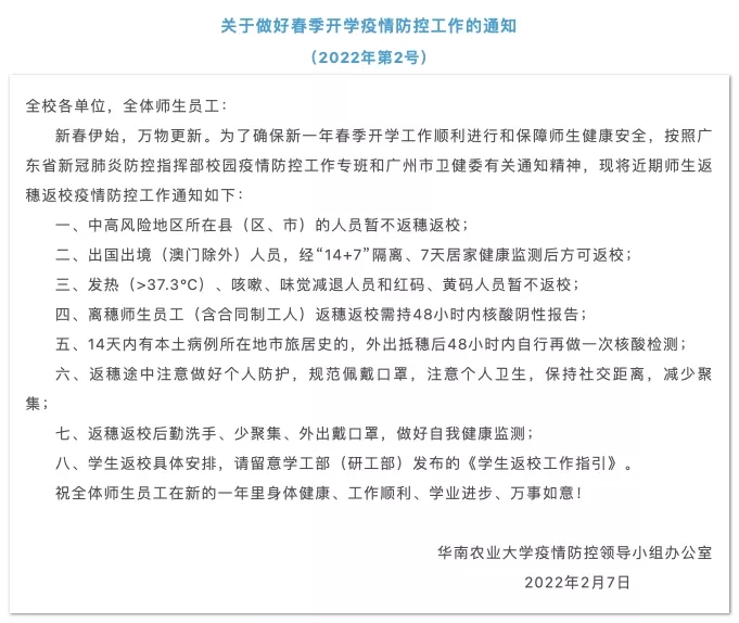 2月7日,华南农业大学发布疫情防控最新通知。通知提到:
