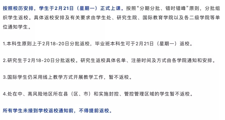 身处中高风险地区的学生推迟返校,待所在地区风险降低至低风险后方可返校;