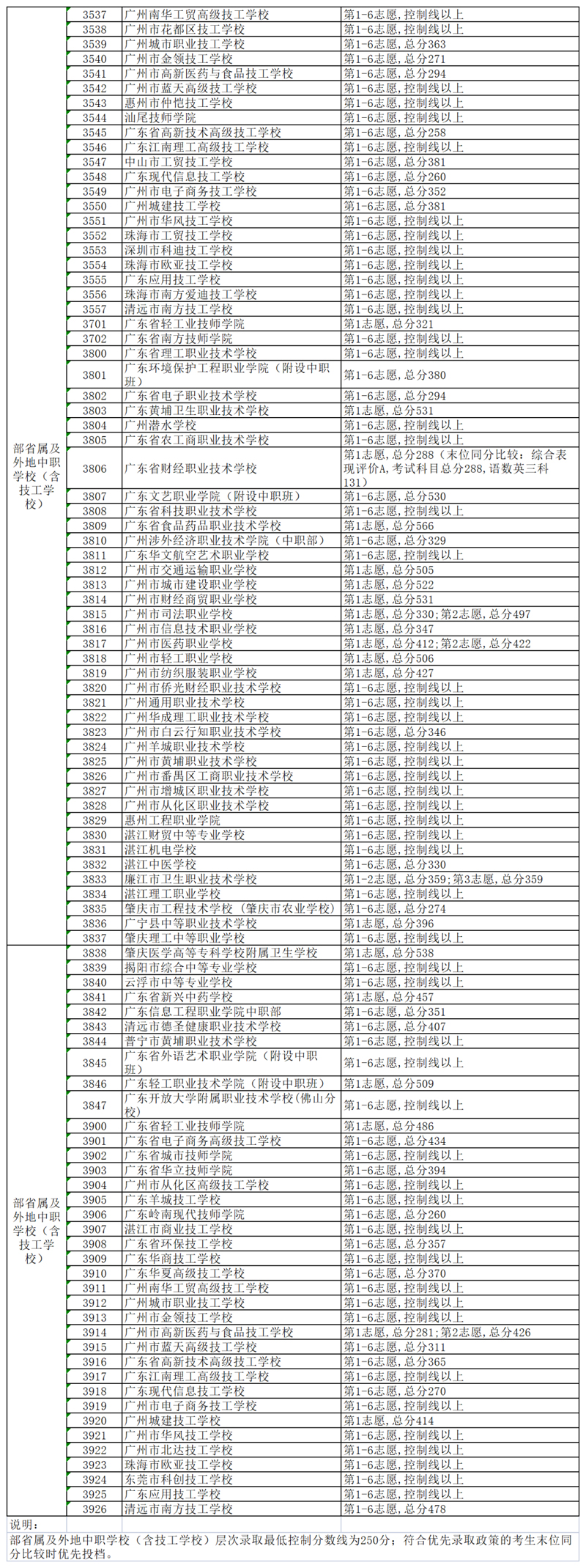 部省属及外地中职学校(含技工学校)层次录取最低控制分数线为250分;符合优先录取政策的考生末位同分比较时优先投档。