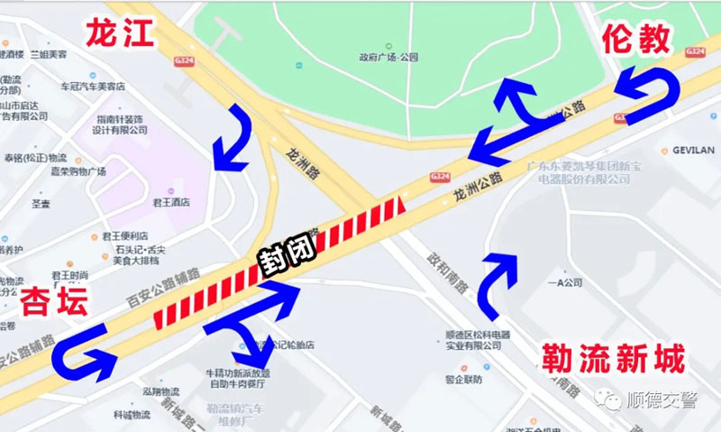 ■ 杏坛往龙江方向(由西往北)的车辆,直行至龙洲路新宝电器对开掉头位,掉头后经龙洲路政和路口右转往龙江方向。