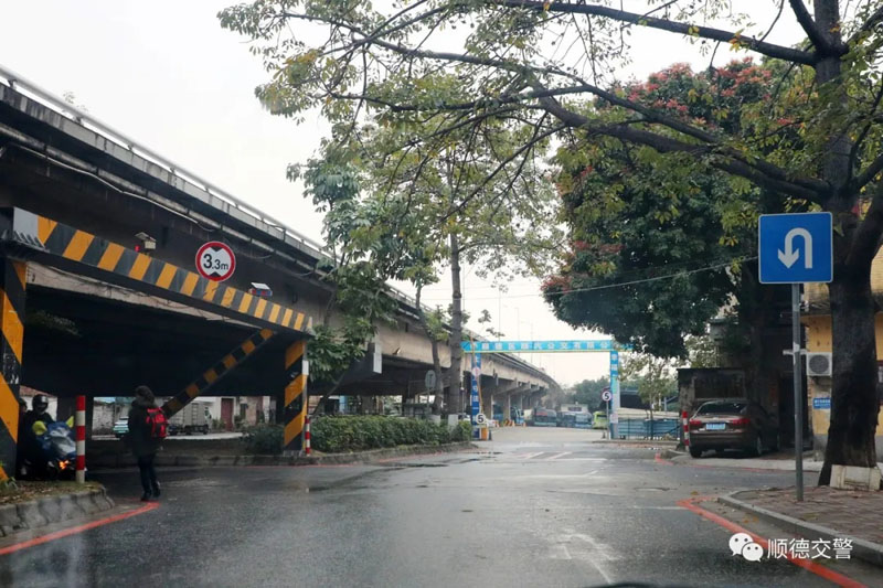 同时该掉头通道桥底路段设有两个掉头位,限高分别为3.3米和4.3米,超高车辆可直行通过百丈大桥往杏坛方向选择路口掉头。