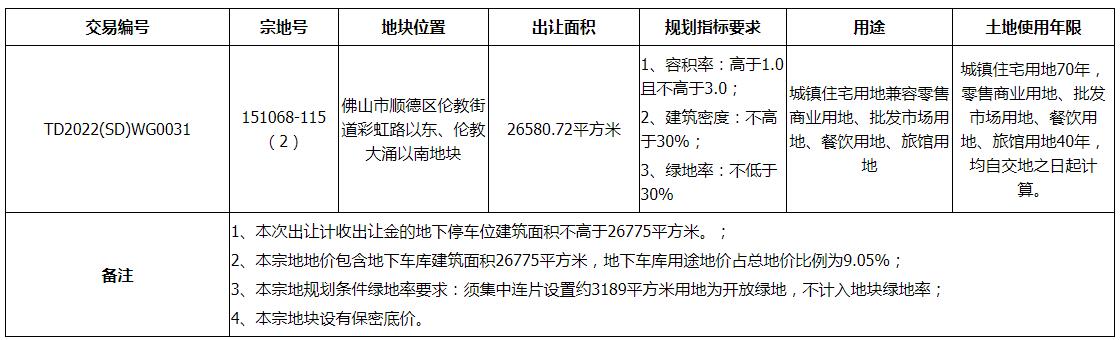 二、竞买资格和要求: 该地块其他规划设计条件具体见该地块的交易文件中所附的顺规条件(2022)0205号《佛山市顺德区建设用地规划条件》。