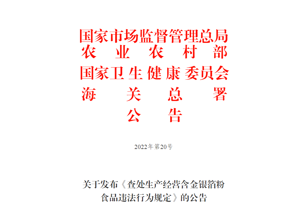 根据《中华人民共和国食品安全法》《中华人民共和国广告法》《中华人民共和国农产品质量安全法》等法律法规,市场监管总局、农业农村部、国家卫生健康委、海关总署联合制定了《查处生产经营含金银箔粉食品违法行为规定》。现予以公告,自发布之日起施行。
