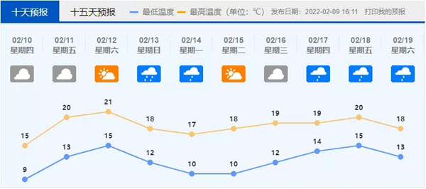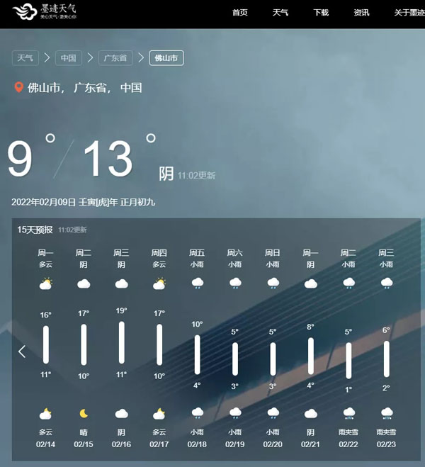 据佛山市气象台预报,预计2月10日,佛山阴天间多云,间中有小雨,2月11日-12日,阴天到多云,可见阳光,早晚有轻雾。