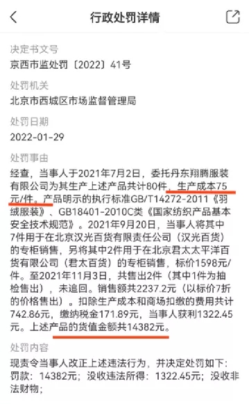 处罚信息显示,衣念(上海)时装贸易有限公司于2021年7月委托丹东翔腾服装有限公司生产80件羽绒服,并于9月将其中的9件用于在北京部分百货的专柜进行销售。该批次羽绒服成本价为75元/件,专柜标价却高达1598元/件,吊牌溢价竟高达20倍。