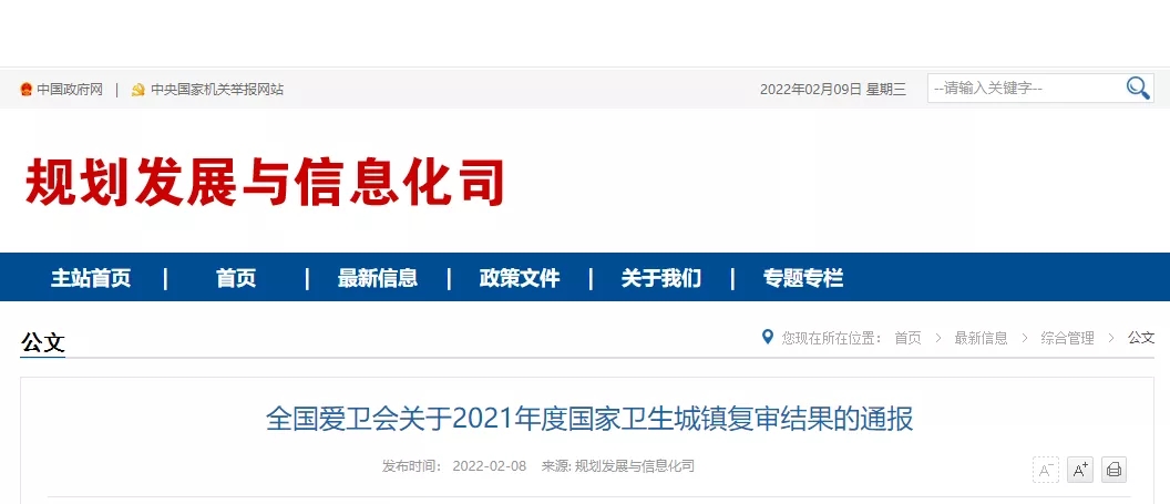 根据国家卫生城镇相关评审管理办法和标准,全国爱卫办组织专家对2021年进入复审程序的国家卫生城市(区)进行了评审,对各地上报的国家卫生乡镇(县城)复审结果进行了抽查。
