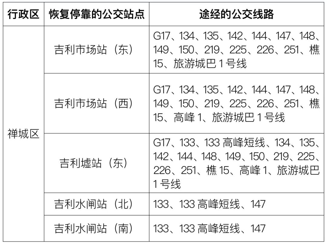 根据佛山市新型冠状病毒肺炎疫情防控指挥部办公室发布的关于解除风险管控区域的通告,途经禅城区南庄镇人和社区万科城7区的G17、219等18条公交线路由2022年8月1日起恢复停靠吉利市场站、吉利墟站、吉利水闸站,具体如下: